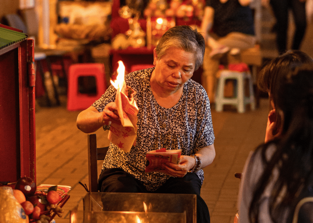 Paper offerings representing wealth are burned for the spirits.