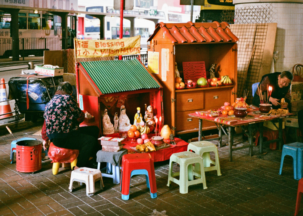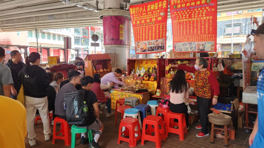 Les praticiennes elles-mêmes possèdent des licences délivrées par le gouvernement — une ironie discrète, l’État hongkongais reconnaissant officiellement le droit de ces femmes de maudire publiquement les ennemis de ses citoyens. Leurs stands ressemblent à de petits sanctuaires : encombrés de figurines de divinités, de bougies, de brûle-encens, de fruits et de listes de prix plastifiées.